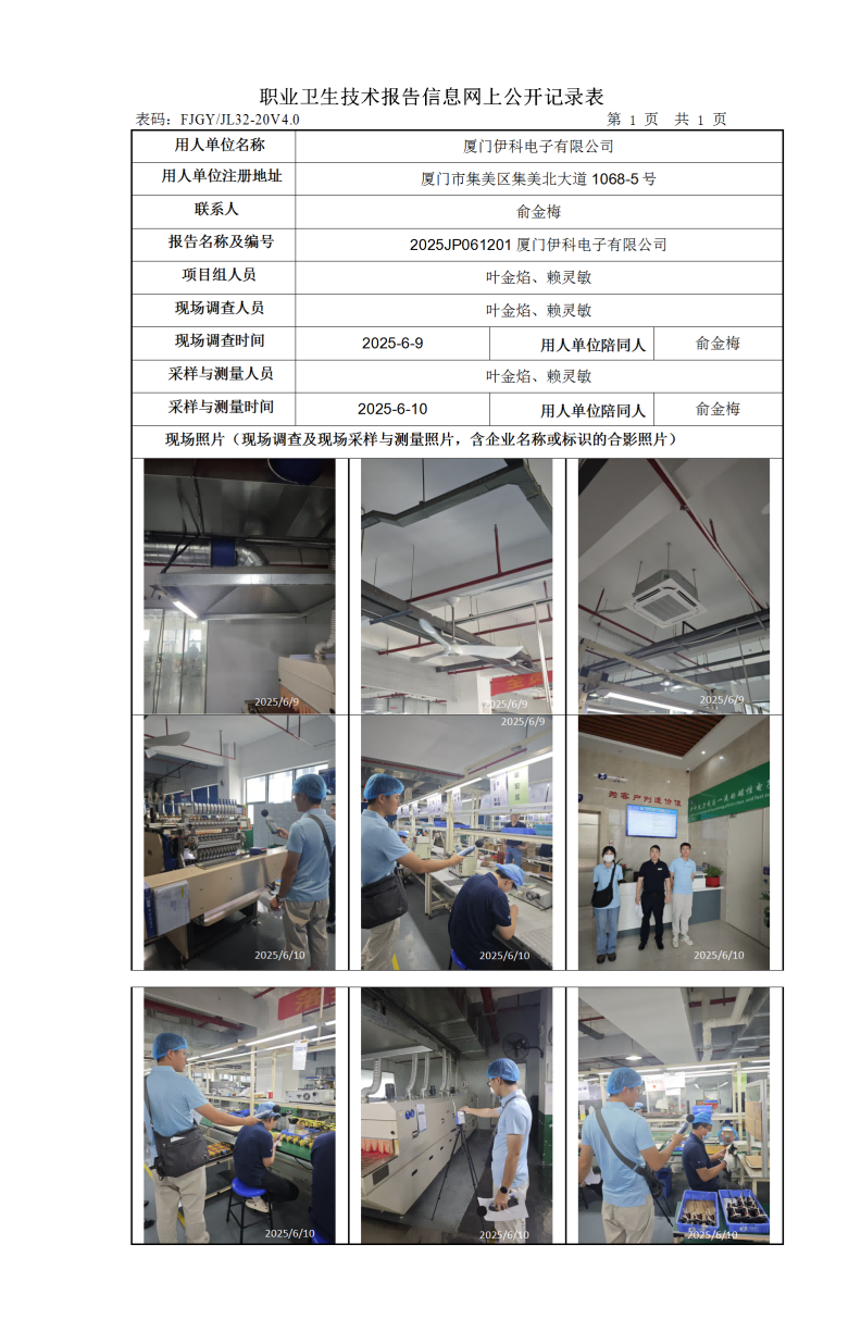 廈門伊科電子有限公司-2025年工作場(chǎng)所職業(yè)病危害因素檢測(cè)